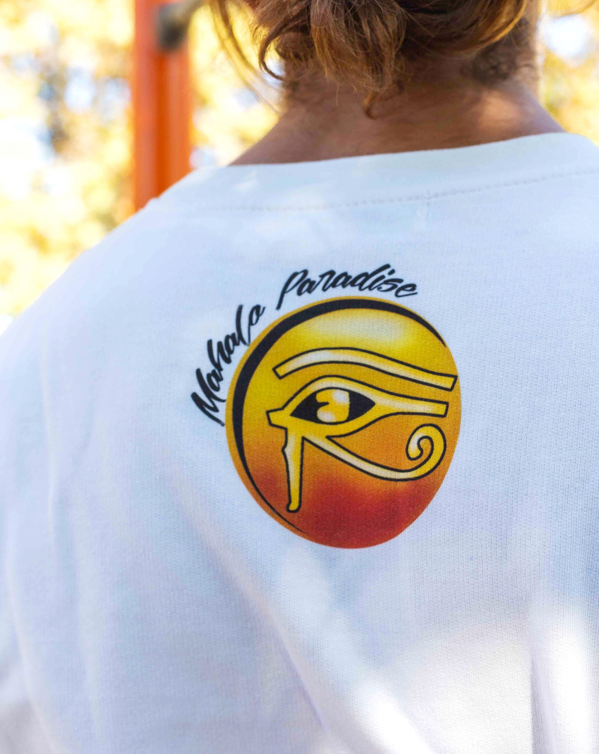 Sudadera unisex 100% algodón con print Escarabajo Egipcio en el pecho y ojo horus espalda, color crudo.